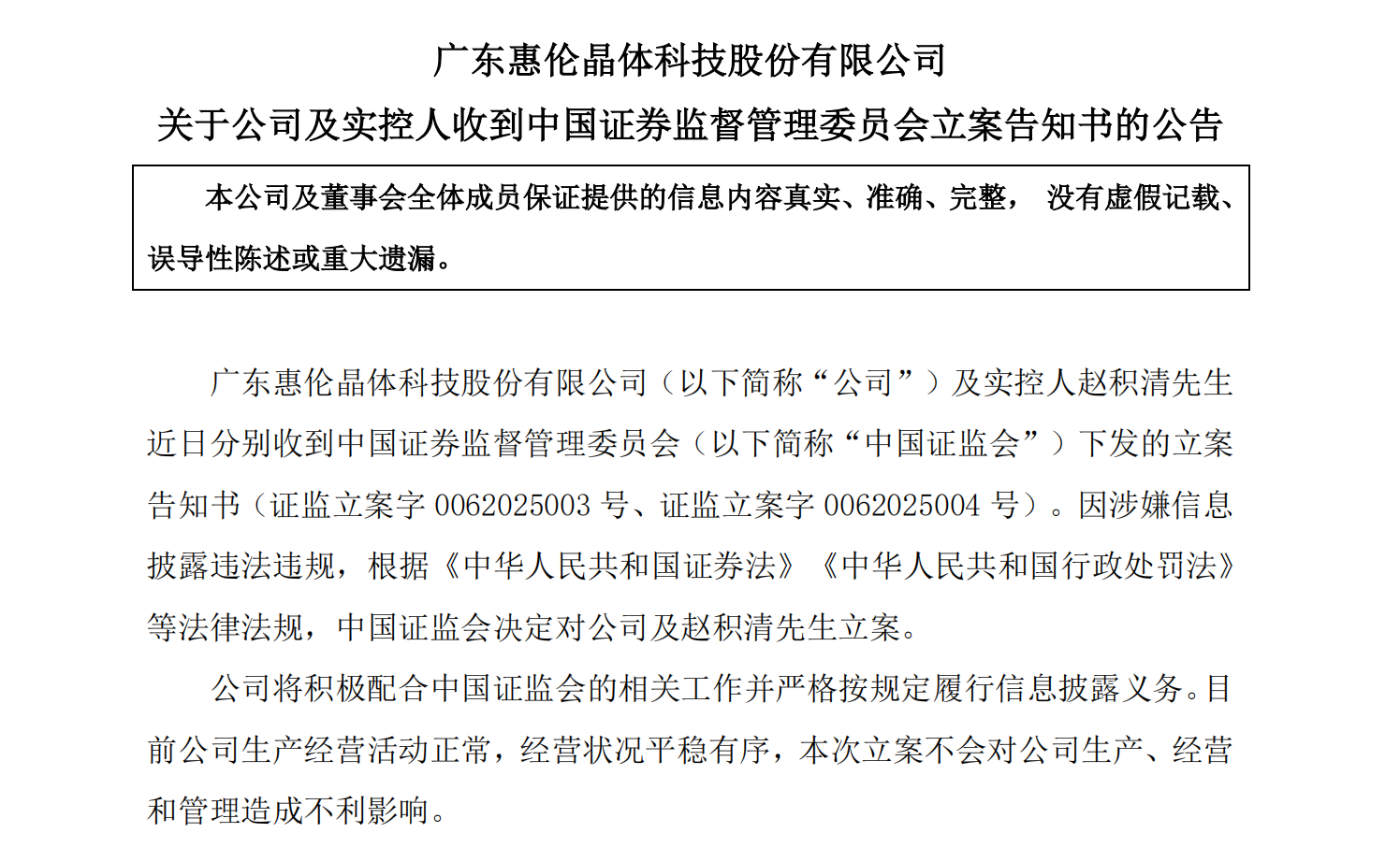 4月24日晚间,广东惠伦晶体科技股份有限公司(惠伦晶体)发布公告,该公司及公司实控人赵积清收到中国证监会下发的立案告知书,因涉嫌信披违规,中国证监会将对公司及赵积清立案。