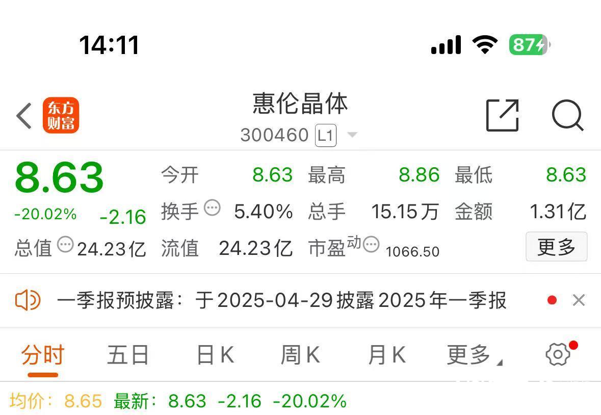 截至记者发稿,4月25日,惠伦晶体股价报8.63元每股,跌20.02%,最新市值24.23亿元。