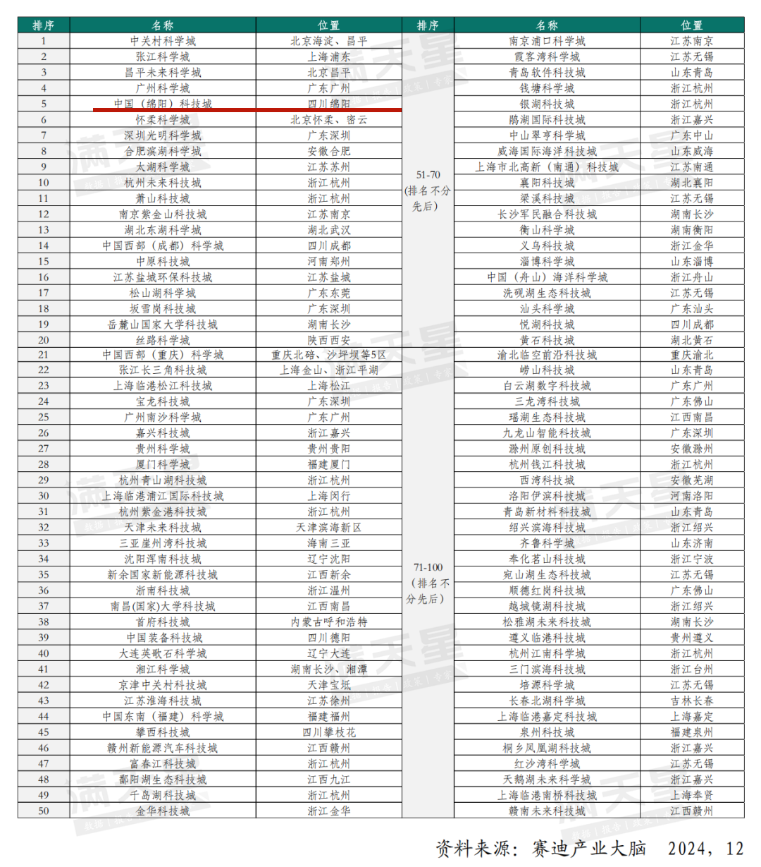 这还不是全部。2025年初,工信部下属机构赛迪顾问城市经济研究中心发布了《科技城百强榜(2024年)》,绵阳一举杀入全国前五,和北上广一同位列“全国四大科技城市”。曾经熟悉的“北上广深”,就这样变成了“北上广绵”。