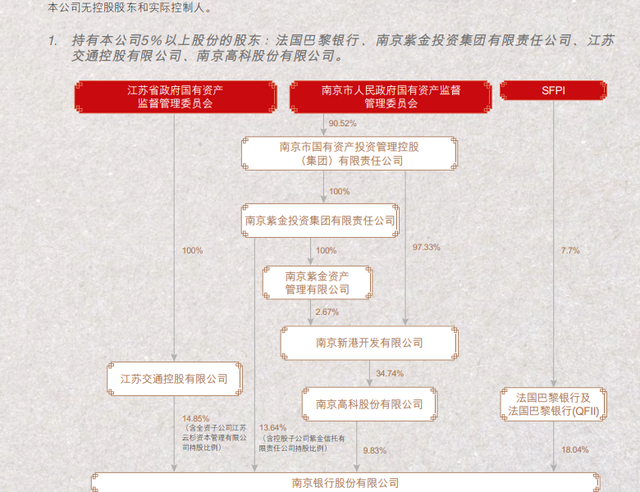 持有南京银行5%以上股份的股东,包括法国巴黎银行、江苏交通控股有限公司、南京紫金投资集团、南京高科(600064.SH),持股比例分别为18.04%、14.85%、13.64%、9.83%。