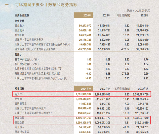 截至2024年末,南京银行资产总额2.59万亿元,较年初增长13.25%,贷款总额1.26万亿元,同比增长14.31%,不良贷款率为0.83%;存款总额1.5万亿元,较年初增长9.26%。