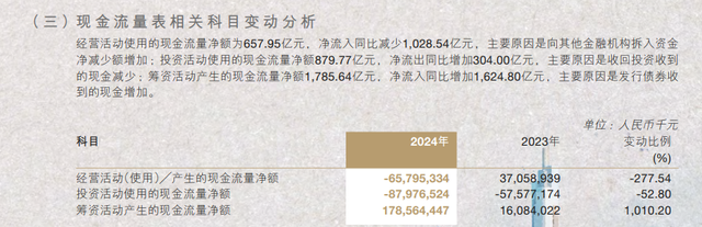 2024年,该行经营活动使用的现金流量净额为-657.95亿元,净流入同比减少1028.54亿元,数据转负,银行解释,主要原因是向其他金融机构拆入资金净减少额增加所致。