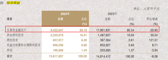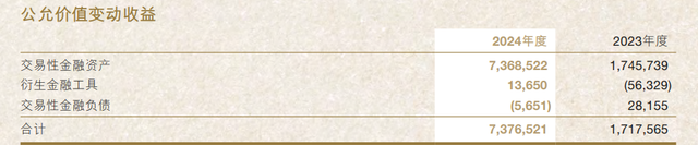 公允价值变动收益暴增,几乎全部来自于“交易性金融资产”,从2023年的17.46亿元激增至2024年末的73.69亿元。