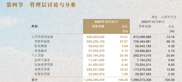 2024年,该行对公贷款余额9362.04亿元,同比增长14.86%;个人贷款余额3201.94亿元,较前一年末增长12.75%。