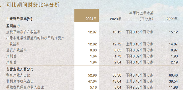 虽然净息差同比收窄10BP至1.94%,但通过优化资产负债结构,即生息资产收益率稳定在3.8%以上,2024年利息净收入266.27亿元,较上年增加11.75亿元,增速为4.62%。而利息净收入占营收比重从2023年的56.36%,降至2024年末的52.96%。