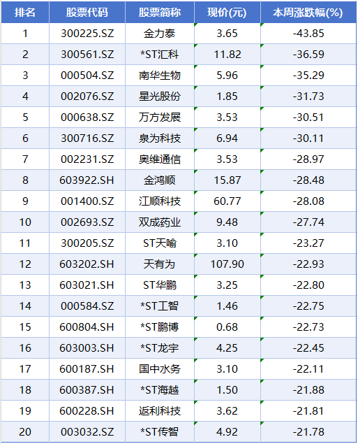 本周个股跌幅榜前五位分别是金力泰、*ST汇科、南华生物、星光股份、万方发展,累计跌幅分别为43.85%、36.59%、35.29%、31.73%、30.51%。