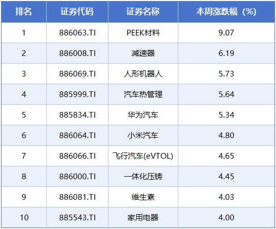 板块方面,本周涨幅居前的概念板块分别是PEEK材料、减速器、人形机器人、汽车热管理、华为汽车等板块,累计涨幅分别为9.07%、6.19%、5.73%、5.64%、5.34%。