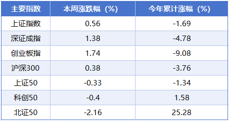 本周(4月21日至4月25日),A股三大指数震荡拉升。截至周五收盘,上证指数累计上涨0.56%,深证成指累计上涨1.38%,创业板指累计上涨1.74%。
