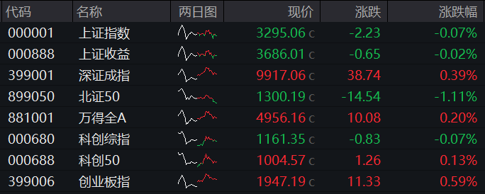 4月25日,三大股指收盘涨跌不一,上证指数报收3295.06点,跌0.07%;深成指报收9917.06点,涨0.39%;创业板指报收1947.19点,涨0.59%。