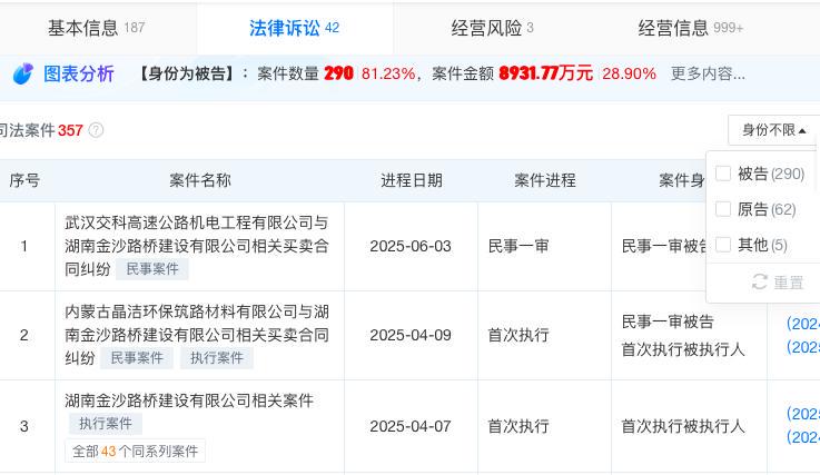 而从此次涉及的三家公司来看,均呈现出一定程度风险。天眼查显示,湖南金沙公司涉及司法案件超350起,作为被告涉诉290起,历史被列为被执行人信息122条,当前历史被列为被执行人信息6条,被执行金额204.94万元。