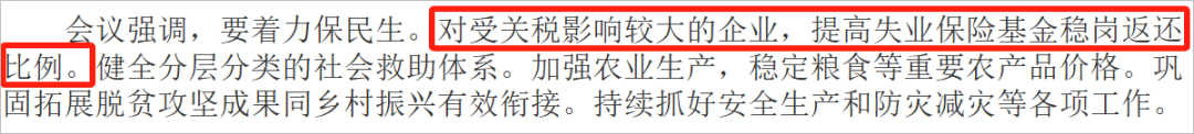 对受关税影响较大的企业,提高失业保险基金稳岗返还比例。