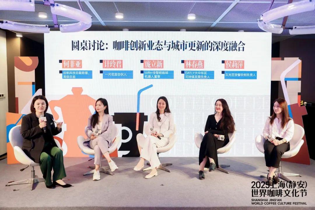 圆桌环节,应帆科技总裁助理、高级总监何非亚偕同一尺花园合伙人计玲君、cofe+全智能咖啡机器人董事庞立新、OATLY大中华区可持续发展负责人林春燕、久光百货餐饮部负责人侯莉萍一起探讨咖啡创新业态与城市更新的深度融合。