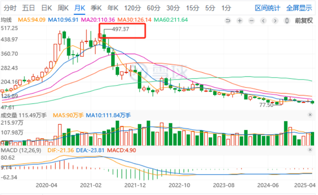 过去两年内,受生长激素行业集采和监管等消息影响,长春高新多次出现暴跌现象,股价已从2021年高点497.54元/股跌至发稿前的85.24元/股,跌幅逾80%。