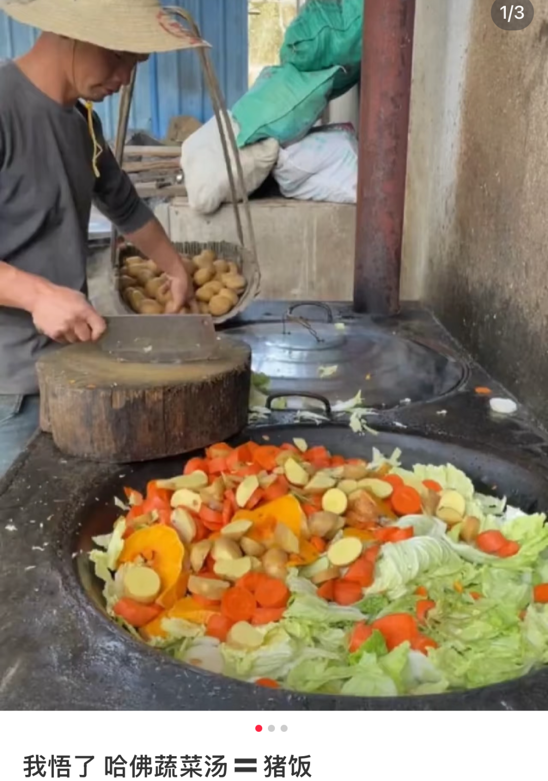 直到有人再次刷到抖音的猪饭博主视频,看到一模一样的食材被主播门丢进农村大铁锅里翻炒熬煮,围栏后的猪蠢蠢欲动,“追求营养健康便捷,打工人逃不出小碗猪饭这个赛道”。