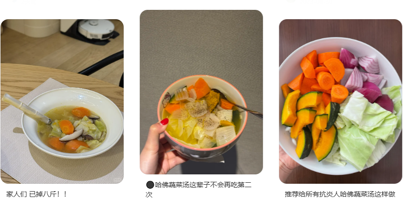 于是归根到底,还是“减脂”最能吸引打工人。“靠喝哈佛蔬菜汤半年瘦了30斤”的传说在互联网上流行。评论区问是不是每天晚上只喝这个,“现身说法”的人不好意思地解释,“有时候忍不住会往里面加包辣泡面。”