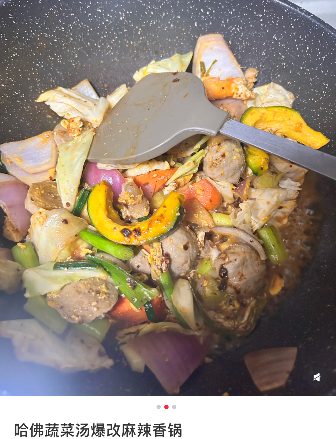 把切好的南瓜、包菜、胡萝卜、洋葱一起丢进锅里,加水加食用油,开火煮20分钟,撒盐和黑胡椒,出锅。美食博主们甚至很难为它单独拍一个教程Vlog。
