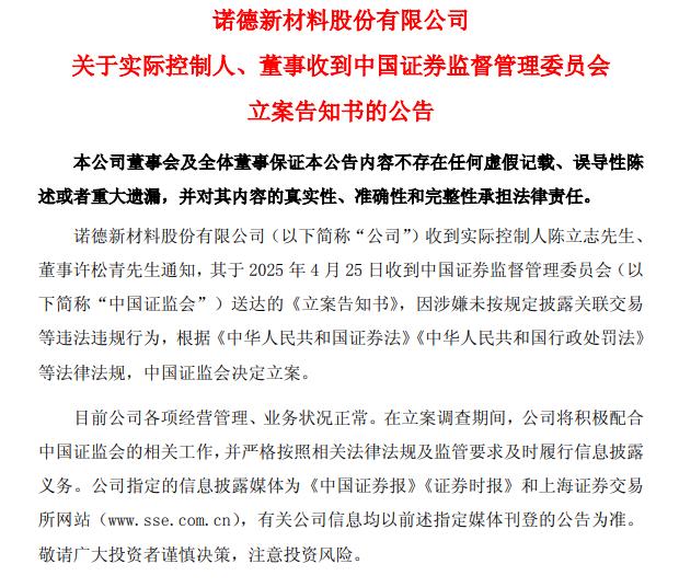 中新经纬4月25日电 25日晚,诺德股份公告,公司实控人陈立志、董事许松青收到《立案告知书》,因涉嫌未按规定披露关联交易等违法违规行为,中国证监会决定立案。