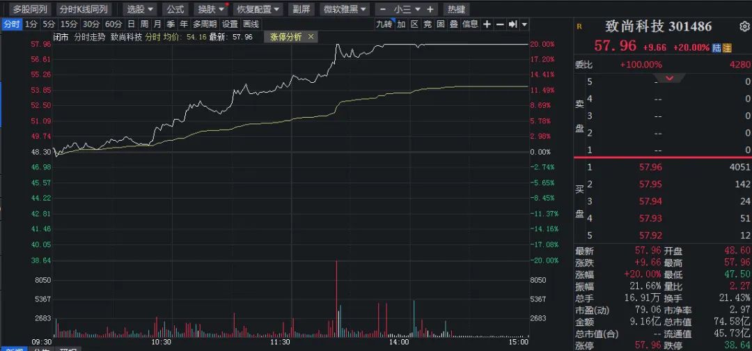 盘面上,AI硬件板块走强,致尚科技、仕佳光子午后触及20cm涨停。电力板块持续走高,九洲集团等10余股涨停。创新药板块多数调整,房地产板块冲高回落。