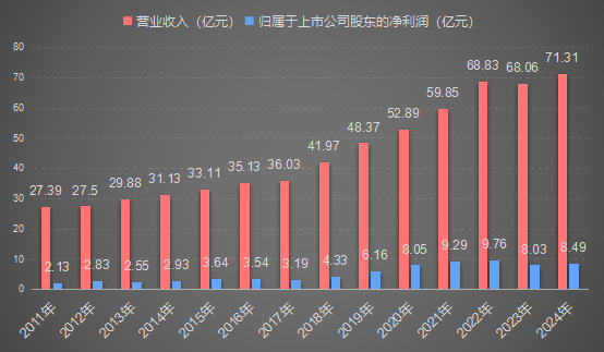 记者梳理公司上市后历年业绩发现,2024年是其上市后营业收入最高的一年,但并非归属于上市公司股东的净利润最高的一年。