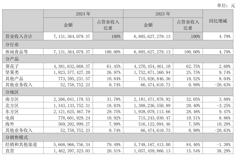 洽洽食品2024年营收构成。企业财报截图