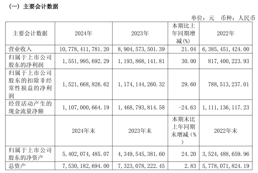 2024年财报显示,营收107.78亿、同比增长21.04%,归母净利润15.52亿、同比增长30%,扣非净利润15.22亿、同比增长29.60%,但经营现金流金额只有11.07亿、同比下滑24.63%,净资产、总资产仍保持增长。