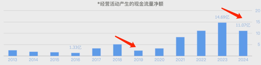 珀莱雅的这份财报显然是很不错的,营收增速超20%、净利润增速超30%,一如既往的保持其高增长的态势。不太好的一点是,珀莱雅2024年的经营现金流下滑的幅度较大,这个下降幅度仅次于上市后的2019年,同时也是2019年以来首次下降。