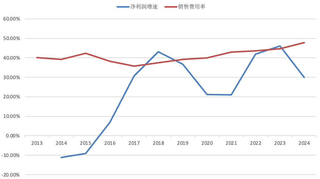 随着珀莱雅净利润增速的放缓,2024年已经出现销售费用率上升、净利润增速下滑的情况,这种情况与上市之前轻微的销售费用率提升就能带来业绩增速的大幅提升形成对比,似乎说明当前珀莱雅以销售驱动的增长策略正在失效。