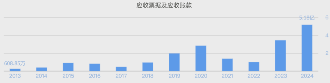 可以看到,近两年珀莱雅的应收账款增长非常快,增速远远高于营收及净利润增速,2023年的增速高达237.29%,2024年增速仍有50.32%。