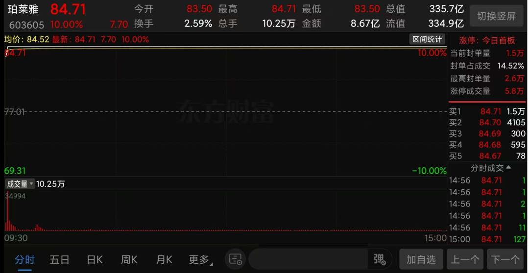 不过,整体而言,珀莱雅的这两份财报都不错,年报净利润创新高,一季度净利润也创了历史新高。业绩新高刺激之下,珀莱雅二级市场股价今天开盘瞬间强势涨停,最新市值达到335亿。