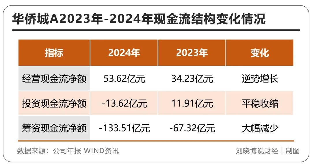 而另一组数据显示,2024年,华侨城A经营性净现金流逆势增长56.67%,有息负债总额下降。