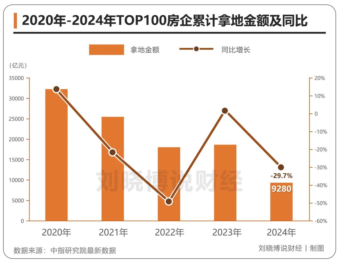 事实上,2020—2024年,TOP100房企拿地总额总体呈下滑趋势。中指研究院最新数据显示,2024年TOP100企业拿地总额9280亿元,同比下降29.7%,相较去年前11月降幅收窄1.8个百分点,已不足2020年的三成。
