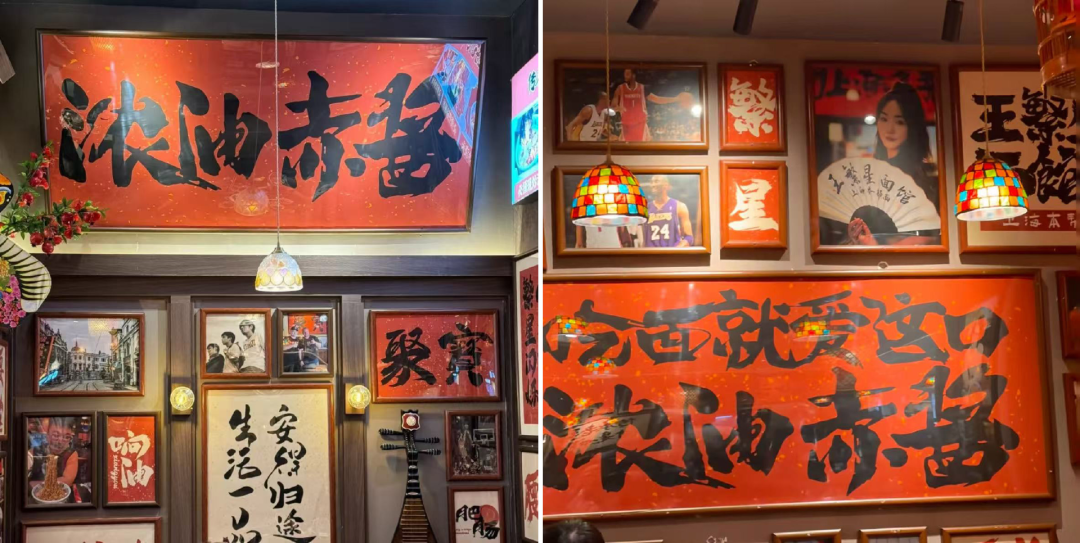 与街头巷尾快餐面店简单的装修不同,这一品类多开在商场,且是城市的核心商圈。同时,装修更具风格化,如王繁星面馆,门店中处处可见的画框,写着“响油”“浓油赤酱”“本帮”等关键词,加上老海报、老照片,共同诉说品类源头,从视觉上给人以“正宗”的先入认知。