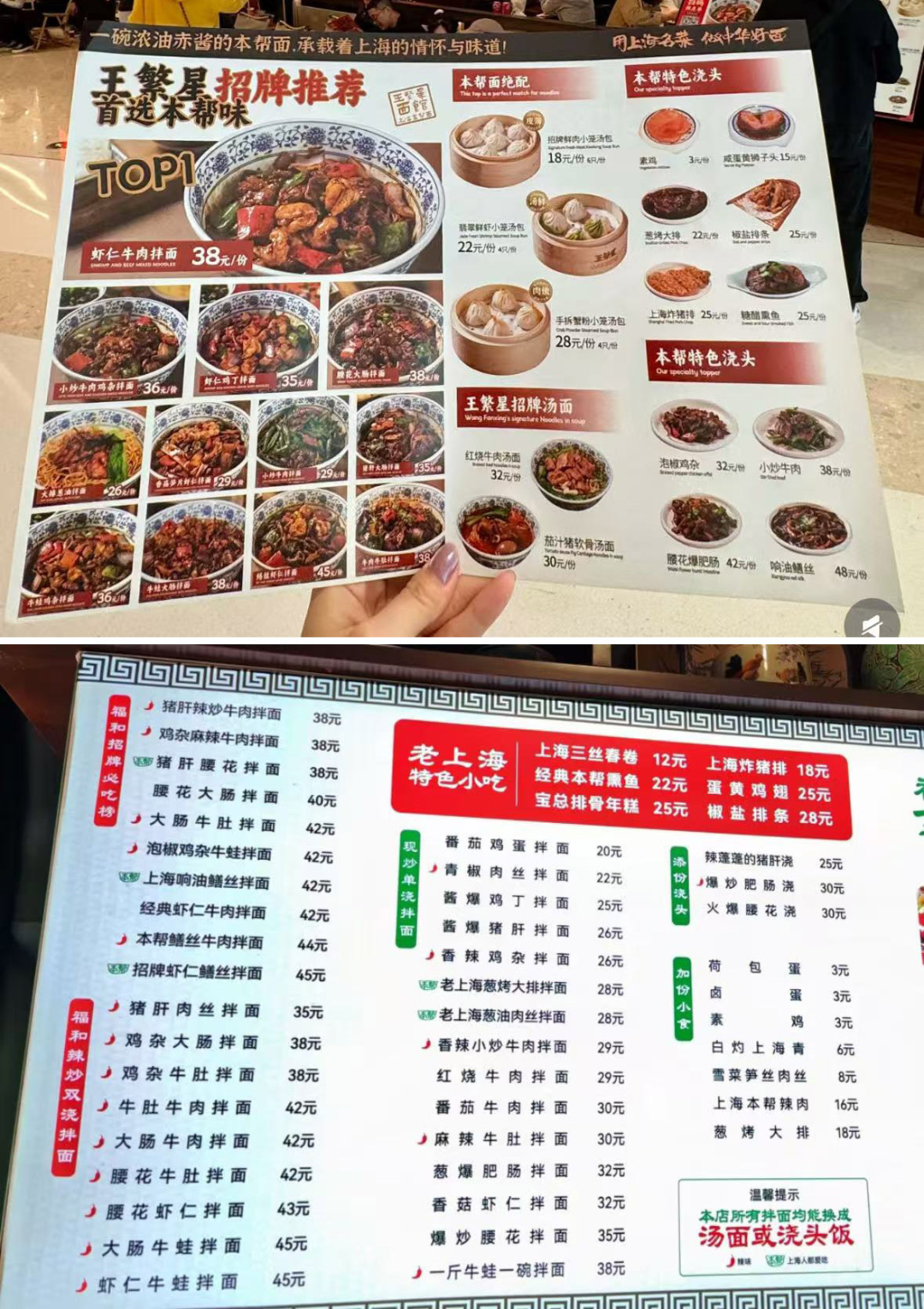 王繁星面馆有一句slogan,用上海名菜,做中华好面。这一口号的心智传播,会让消费者产生一种联想,现炒浇头等同于菜,三十多元的双拼拌面,相当于吃到了两道菜,这两道菜还是有地方特色的,更值得了。