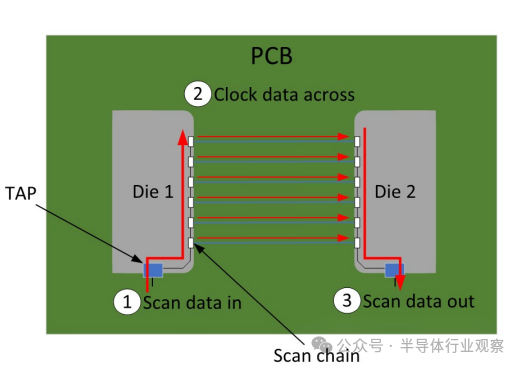 JTAG 最初用于测试 PC 板连接。通过将数据加载到芯片的每个引脚,可以在连接的芯片上检测到结果,从而验证 PCB 连接的完整性。同样的方法也可用于测试封装基板上的芯片。