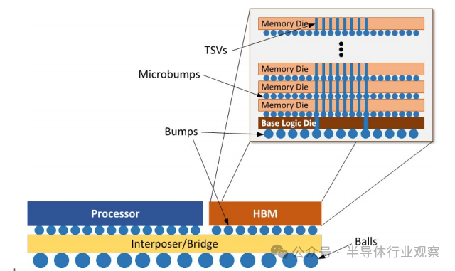 图 6:先进封装中的 3D 堆叠 HBM。单个 HBM 单元包含多个独立的薄型存储器芯片,这些芯片通过小间距微凸块进行通信。TSV 将信号从顶部芯片向下传输到底部芯片。如图所示,处理器位于 2.5D 配置中的 HBM 旁边。