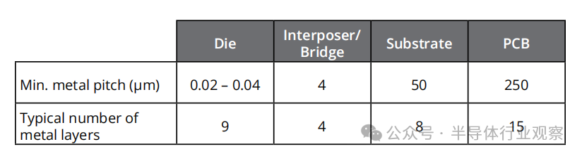封装所用的基板与印刷电路板相似,但它们与高密度互连 (HDI) 印刷电路板最为相似。与印刷电路板一样,它们由电介质层和金属层交替组成。因此,它们也类似于半导体的线路后端 (BEOL),后者也是由电介质层和金属层交替组成。但基板的特点是采用有机电介质,而不是氧化物。印刷电路板和基板之间的区别更多在于尺寸而非材料。