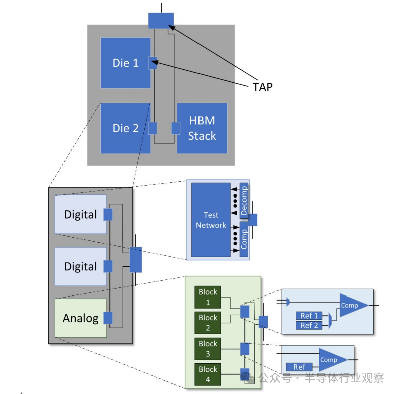 图 30:包含两个芯片和一个 HBM 堆栈的示例封装。每个芯片包含两个数字模块和一个模拟模块。数字模块通过 IEEE 1687 进行测试;模拟模块通过未来的 IEEE 1687 .2 进行测试。HBM 堆栈的逻辑可以通过 JTAG 进行测试,并使用 MBIST 测试存储单元。