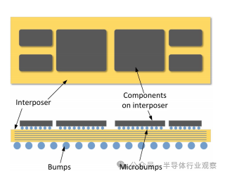 图 5:基本先进封装元件。与所有封装一样,它包含一个基板。它还包括一个中介层,元件安装在中介层上并相互布线。微凸块将芯片连接到中介层,凸块将中介层连接到基板,球将基板连接到 PCB。