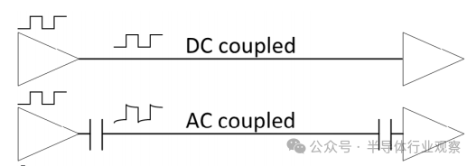图 28:直流耦合线路与交流耦合线路。交流耦合线路上的电容器可消除连接中的直流电流,但需要信号转换才能通过电容器