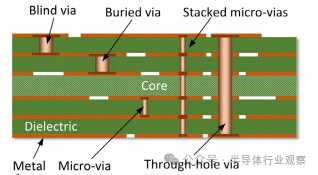 金属层有两种功能:一种是将信号从封装内的芯片连接处传输到印刷电路板上的焊接连接处;另一种是将信号从封装内的芯片连接处传输到印刷电路板上的焊接连接处。根据信号的路径,可能需要一层或多层。通孔提供金属层之间的连接,有三种类型: