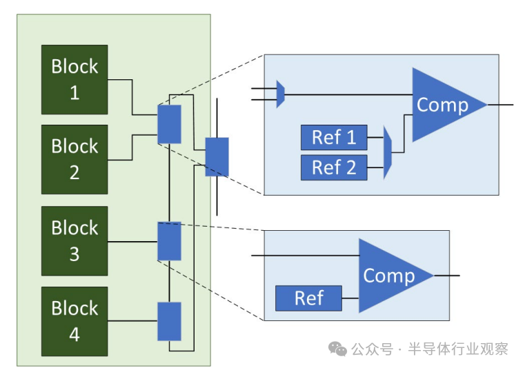 图 29:一组模拟测试示例。测试块可安装在扫描链上,但它们包含信号值与参考值的比较。具体测试高度依赖于正在执行的模拟功能。一个测试块可以对多个功能进行多路复用测试,或者每个功能可以有自己的测试块。