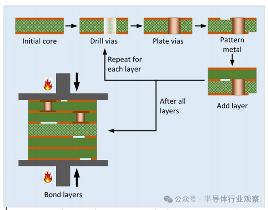 基板通常以核心为起点,核心是一层刚性的有机电介质,两面都有铜。基板的结构是添加式的,这意味着基板是通过添加材料制成的--在这种情况下,是建立额外的电介质层和金属层。这也是该工艺的另一个描述性名称:堆积工艺。