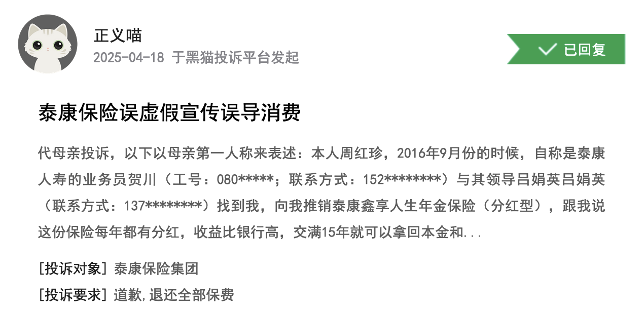 该网友母亲的遭遇不是个案。黑猫投诉平台上,截至4月18日,针对泰康人寿发起的投诉已经达到15000多起,大多都直接指向虚假宣传、诱导消费,很多都直接提出了退保的要求。