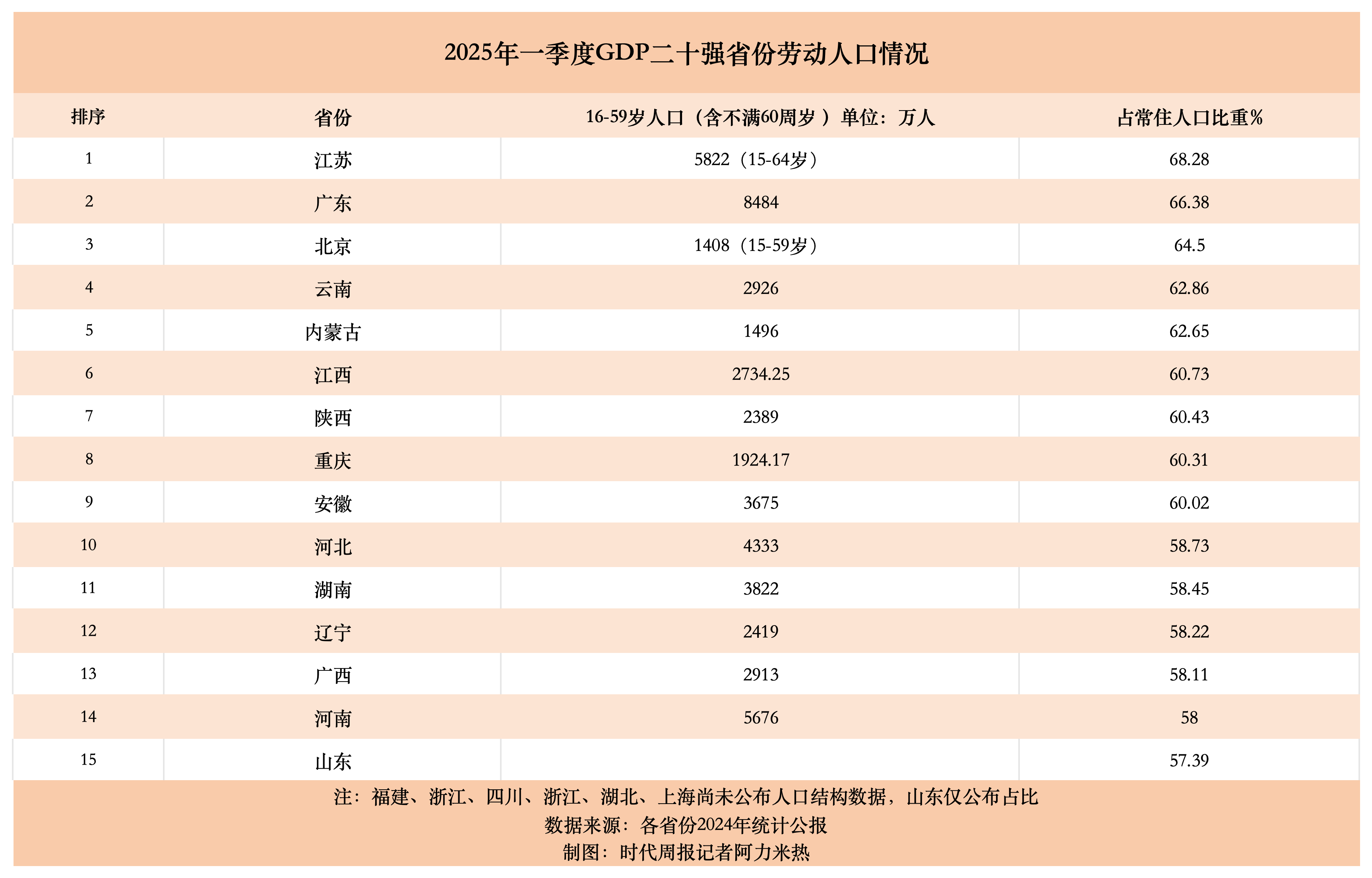 由于江苏(15-59岁)、北京人口(15-64岁)结构统计口径不同,如果将它们纳入统一比较,那么劳动人口占比排名前五的省份依次为:江苏、广东、北京、云南和内蒙古。