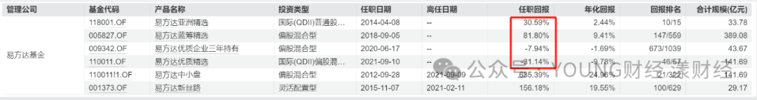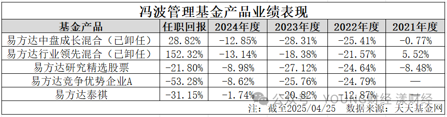 冯波虽未卸任副总职位,但其业绩曲线同样不容乐观。例如其近期卸任的两只基金产品——易方达行业领先和易方达中盘成长,近三年的收益率全线告负,即便在2024年市场反弹中仍均录得双位数亏损。而其目前仍在管理的三只基金自成立以来均未实现盈利,其中易方达竞争优势企业基金成立四年多时间,亏损幅度已超过50%。