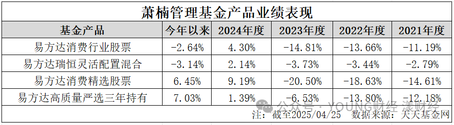 天天基金网数据显示,萧楠执掌的四只基金产品在2021年-2023年期间均录得负收益,其中,易方达消费行业股票三年(2021-2023年)累计亏损达39.66%,易方达消费精选股票同期亏损高达53.74%。即便在2024年市场回暖阶段,其产品收益率仍整体落后沪深300指数14.68%的增长率。