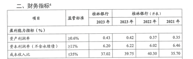 但桂林银行盈利能力指标却低于监管标准。2021-2023年,桂林银行资产利润率分别为0.35%、0.37%、0.42%,均低于≥0.6%的监管标准;资本利润率分别为6.46%、6.02%、6.22%,均低于≥11%的监管标准;成本收入比分别为35.7%、40.30%、39.75%,均高于≤35%的监管标准。