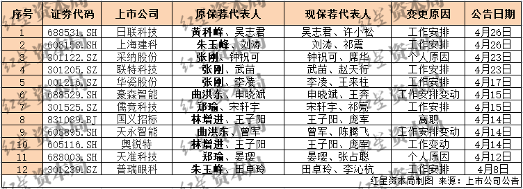 4月26日,上海建科(603153.SH)、日联科技(688531.SH)均发布公告称,收到国泰海通出具的关于更换公司持续督导保荐代表人的函。这两家上市公司分别表示,因工作安排,黄科峰、朱玉峰不再继续从事对公司的持续督导工作,国泰海通委派其他保荐代表人来履行相应工作。
