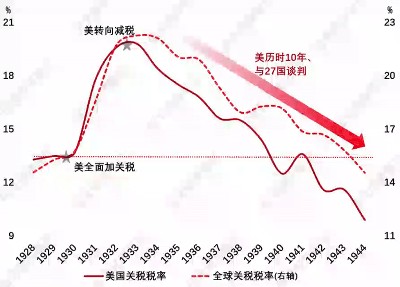 3.历史来看,关税上升往往急促,但降低却较为缓慢,存在明显的时长不对称性。“解铃还须系铃人”。过往关税冲击的发起者,最终也可能成为率先转向减税的“终结者”,但前提是其充分感受到了其负面影响,甚至所付出的成本高于他国。