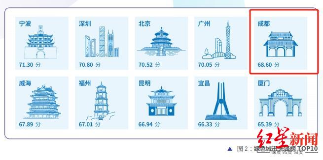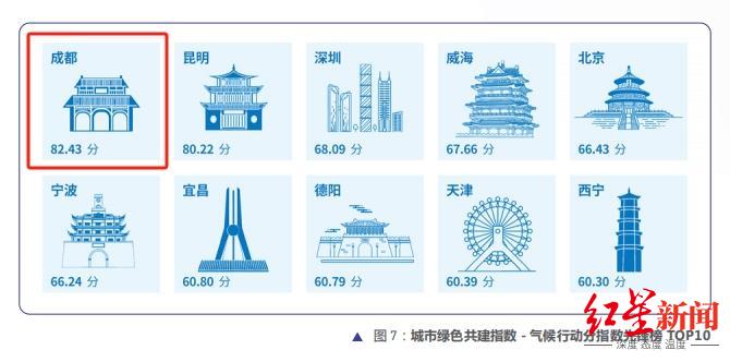 在首期开展的100城市评价中,城市得分分布于44-72分之间。其中,成都以68.60分位居全国第五,并在气候行动维度中以82.43分居TOP10榜首。